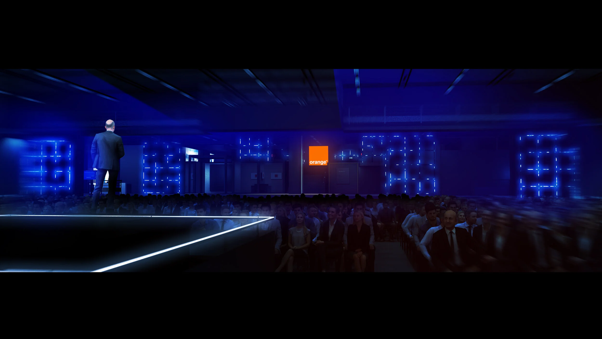 Habitué à des mises en scène spectaculaires, nous avons choisi de dérouter le public en l’immergeant dans une boite noire où il découvrait une scénographie trapue et minimaliste. Pour seul élément visible, un imposant logo Orange flottant au-dessus d’une scène centrale carrée, élevée tel un ring, et soulignée par un liseré de lumière orange.